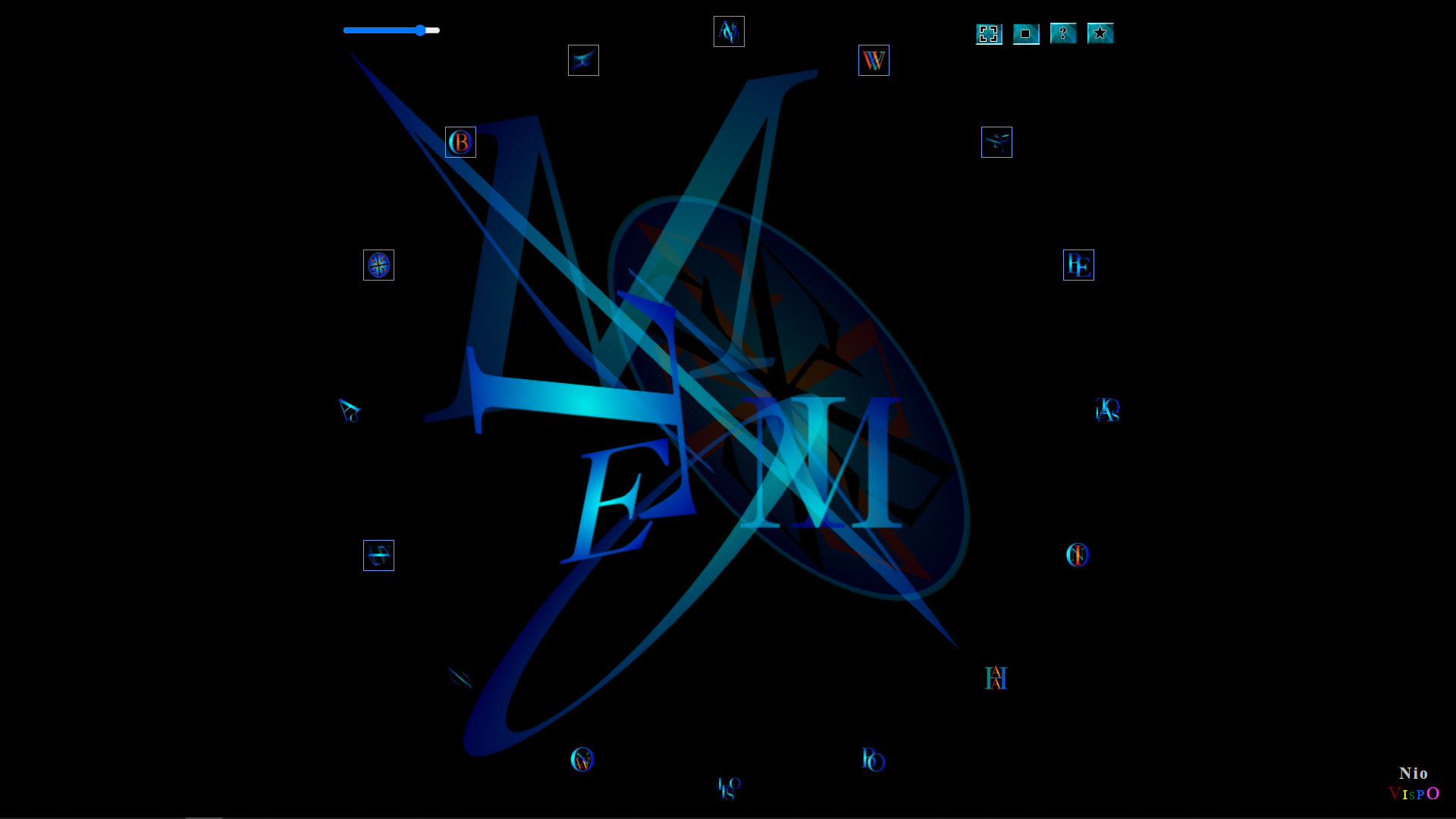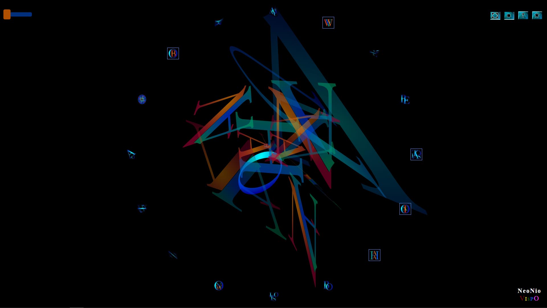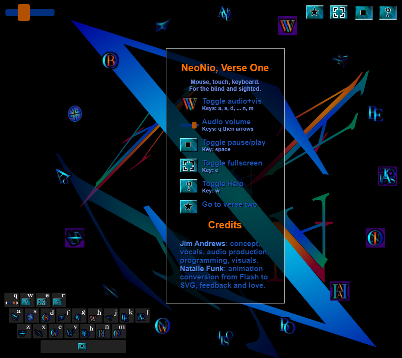Nio, like Jim Andrews's earlier visual poetry, explores the idea that poetic experience is not the exclusive territory of words and lines. The work casts the interactor in the position of composer, mixing and sequencing doo-wop voice audio samples and corresponding lettristic animations that swirl about in three dimensions. Without providing any form of explicit representation, the piece creates a playful environment for evocative synesthesia.