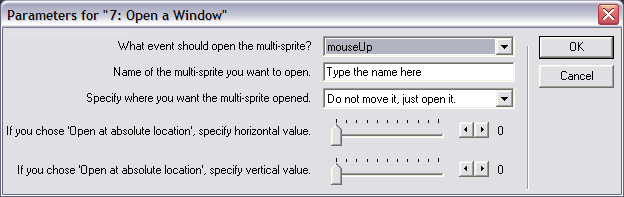 "7: Open a Window" behavior onto a sprite, the following dialog