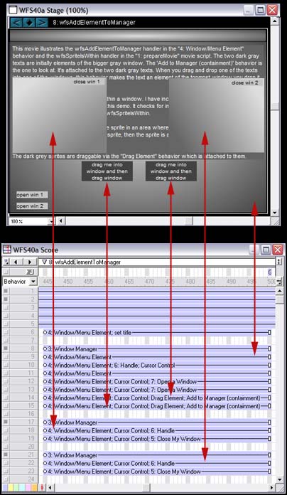 Tutorial 4 Tutorial 4: wfsAddElementToManager and wfsSpriteIsWithinThis tutorial explains how to implement the sort of functionality you see in scene 8 of the feature tour. In this scene, when you do what a text says, namely "drag me into window and then drag window", you see that the text becomes an element of the window onto which it is dropped. This tutorial shows you how to use the "Add to Manager (containment)" behavior and also shows you how that behavior was written using the wfsAddElementToManager and wfsSpriteIsWithin handlers that are part of the WFS API. Looking at the Score and stage of scene 8, the source code for which is in WFS48x.DIR in the 'samples' folder of your copy of WFS 4, we see the following: First, notice that if you have done tutorial 1, you are familiar with almost all of the behaviors we see in the Score. There are only two you haven't seen before: "set title" on sprite 6 and "Add to Manager (containment)" on sprites 14 and 15. "set title" is not really relevant to this tutorial. Sprite 6 is the sprite at the top of the stage that says "8: wfsAddElementToManager". The "set title" behavior just sets the text in sprite 6, makes it be the text of the marker we see in the Score. But the "Add to Manager (containment)" behavior on sprites 14 and 15 is the focus of this tutorial. It contains all the code associated with allowing sprites 14 and 15 to become elements of different windows. The "Add to Manager (containment)" behavior is in the Cast named "8: wfsAddElementToManager" in WFS48x.DIR. Notice also that the red arrows in the above diagram are chosen so that the above diagram clues you in to the correspondence between the Score and the Stage. Sprites 8-15 form the big window. Sprites 17-19 form the lighter gray window on the left, and sprites 21-23 form the other window on the right. Basically all you need to know, unless you are interested in the details, is that to make an element of a multi-sprite such that you can drag it into a window and make it become an element of that window is this: